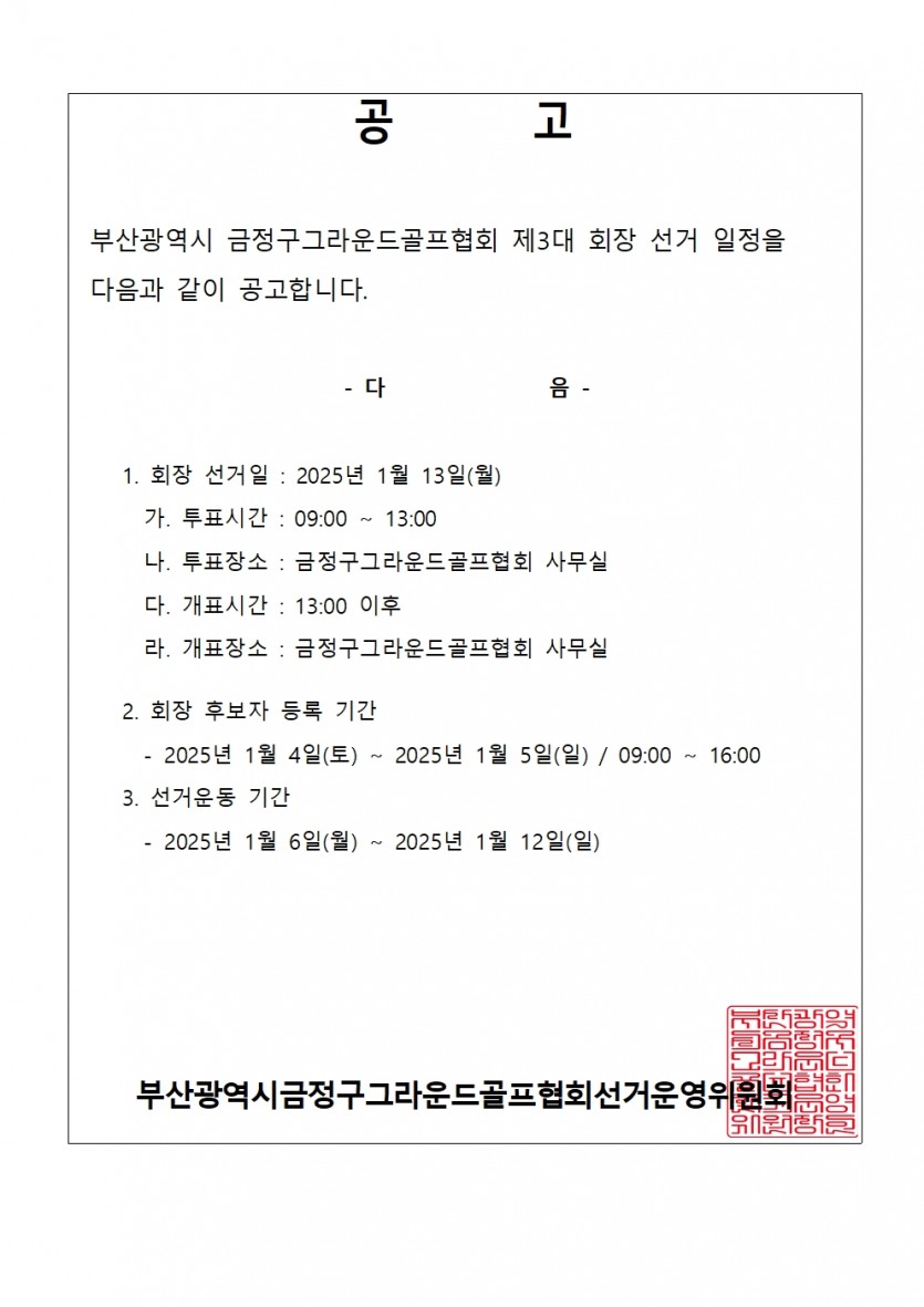금정구그라운드골프 회장선거 관련 공고